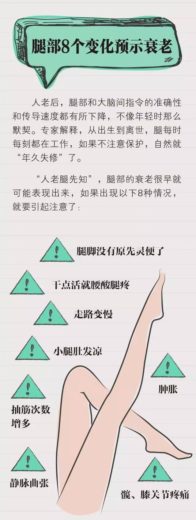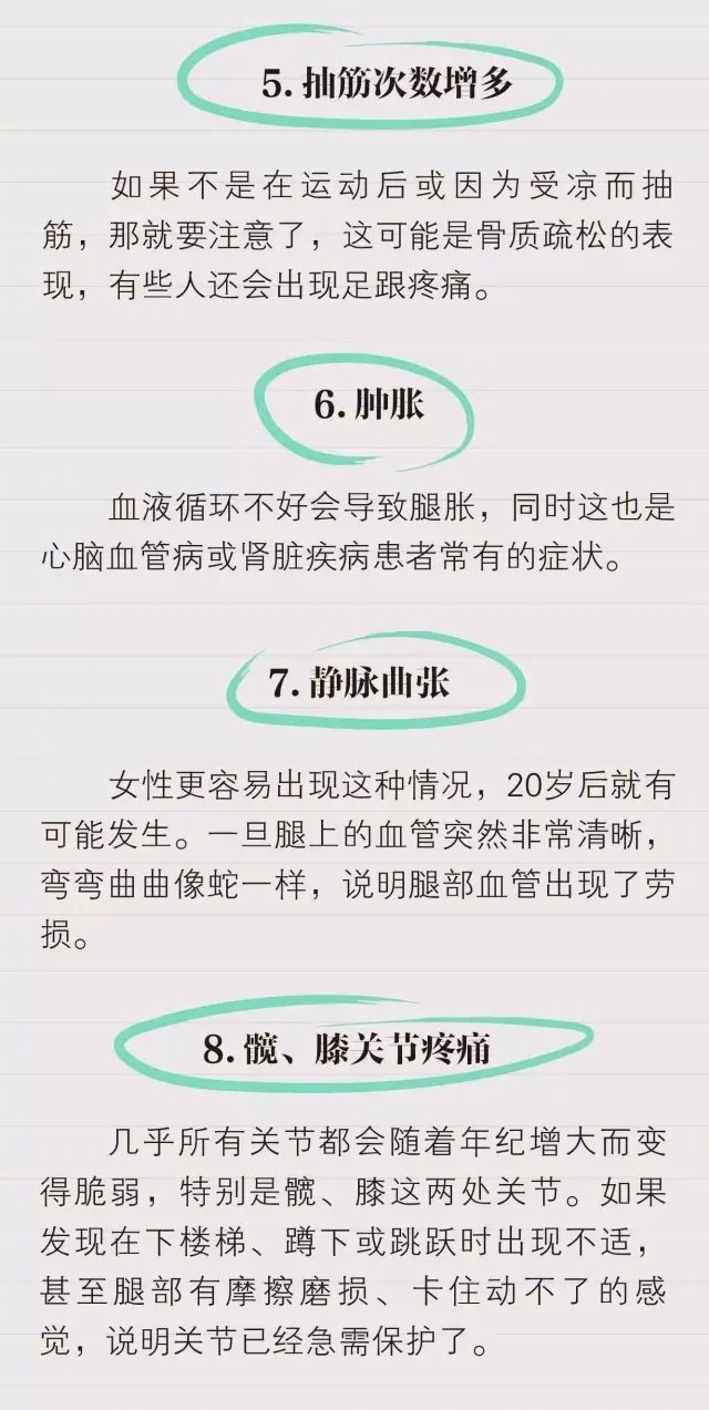 護(hù)腿秘籍,有種說(shuō)法, 腿是人的第二心臟。哪些方式最傷腿?腿部的哪些變化預(yù)示著衰老?怎么護(hù)腿?看看這份秘籍~