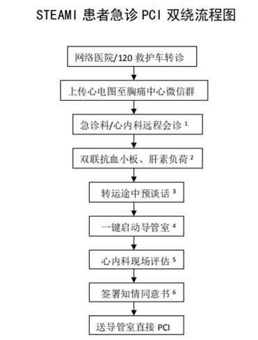 胸痛中心對急性心肌梗死的救治,已不局限在院內(nèi)綠色通道的建立,而把救治工作延伸到院前,這樣才能更大程度地縮短急性心?;颊呖偟男募∪毖獣r間。按照以往的經(jīng)驗,患者到達急診科,掛號,繳費,檢查至少需要30-60分鐘,如果患者收到病區(qū)或者CCU再到導管室至少需要1.5-2小時。為節(jié)省這些時間,胸痛中心實行繞行急診科,繞行CCU的“雙繞”模式,即患者經(jīng)120救護車,不能做介入的醫(yī)院診斷為急性ST抬高型心肌梗死,決定轉(zhuǎn)往能做急診介入的胸痛中心,不經(jīng)過急診科,CCU的處理,直接送到導管室,接受手術,從而有效地縮短患者的救治時間,更多的心肌。我們胸痛中心經(jīng)過實行“雙繞”,已經(jīng)把患者從到達醫(yī)院大門至開通血管的時間縮短為21~22分鐘。心肌總的缺血時間縮短為50分鐘。