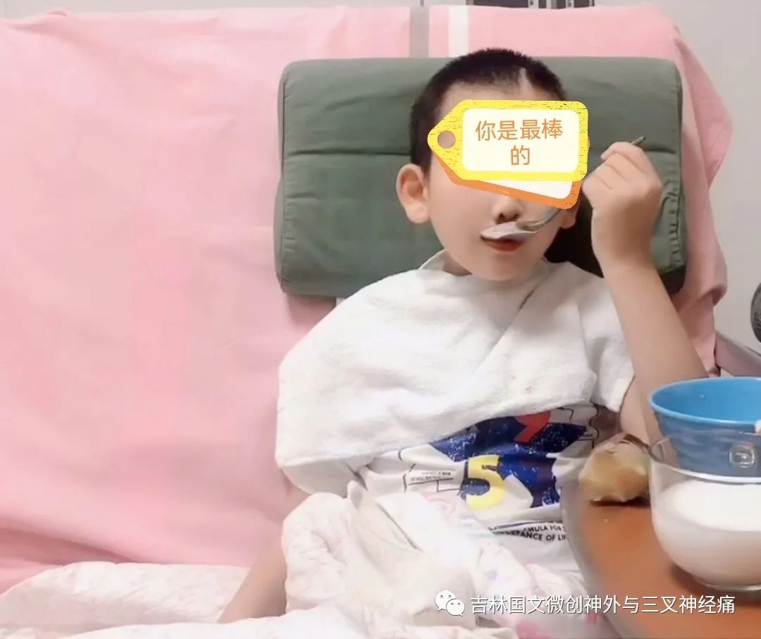終于!功夫不負(fù)苦心人,在術(shù)后11天的時(shí)候病人能睜眼了,還能發(fā)出聲音,這一突破不僅讓家屬喜極而泣,也讓我們?nèi)f分高興,同時(shí)也松了一口氣,主任說,這孩子的命總算保住了。在護(hù)理姐妹的精心的護(hù)理與治療下、在家人無微不至的照顧下,現(xiàn)在這個(gè)小病人不但能進(jìn)行語言交流,而且還能自己吃飯,肢體功能有了很大的進(jìn)步,攙扶著已經(jīng)能夠站立了。每次查房看著孩子天真爛漫的笑容和揮揮手說一聲“謝謝”,心中無比的自豪,因?yàn)槲乙彩沁@個(gè)團(tuán)隊(duì)的一員。