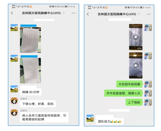 到達附近醫(yī)院時胸痛的癥狀愈加強烈,甚至連說話的力氣都沒有了。接診的是一個有經(jīng)驗的資深醫(yī)生,立即意識到他病情的嚴重性。首先為其做了心電圖,結(jié)果不出所料,診斷為急性下壁心肌梗死,三度房室傳導阻滯(致命性的心律失常),心源性休克。這可是心血管內(nèi)科的急重癥,對患者來說隨時都有致命生命危險,由于所處醫(yī)院不具備胸痛病人救治能力,醫(yī)生建議他馬上到我院胸痛中心進行就診,盡快做造影開通血管,于是醫(yī)生立刻通過區(qū)域內(nèi)胸痛救治微信群與我院胸痛中心取得聯(lián)系,我院胸痛中心接到通知后,立即提前做好救治病人準備。