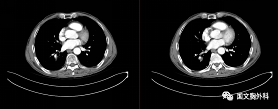 入院時胸部CT,提示:胸部CT平掃+增強:右肺下葉占位,符合肺癌表現(xiàn),伴周圍阻塞性肺炎。縱隔、右肺門稍大淋巴結(jié),轉(zhuǎn)移不除外。