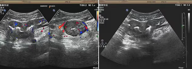 轉(zhuǎn)診至我院后,腸鏡檢查有了重要發(fā)現(xiàn) —— 王女士腸道內(nèi)存在不規(guī)則腫物,腫物表面出現(xiàn)潰爛出血的情況,還導(dǎo)致了腸腔狹窄。這一發(fā)現(xiàn)讓病情的排查有了方向,隨后超聲科接診,立即啟動重點探查,力求更精準(zhǔn)地了解病變情況。