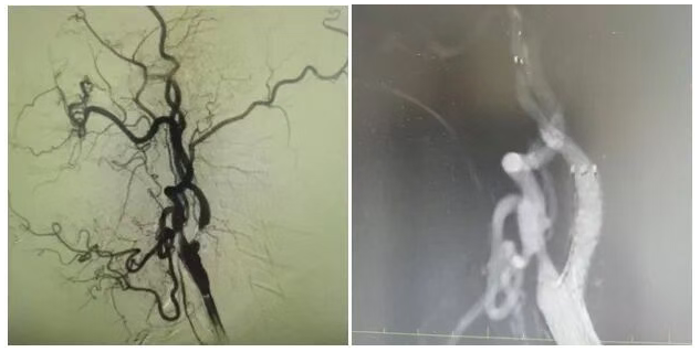 手術(shù)當(dāng)天,丁金明主任親自操刀,團(tuán)隊默契配合:在姜大爺右側(cè)腹股溝穿刺股動脈置入動脈鞘,沿鞘送導(dǎo)絲和導(dǎo)管,在 DSA 引導(dǎo)下穿過狹窄部位,用球囊預(yù)擴張后,精準(zhǔn)釋放頸動脈支架。術(shù)后 DSA 顯示左側(cè)頸內(nèi)動脈血流通暢,狹窄解除。手術(shù)歷時 1 小時,姜大爺生命體征平穩(wěn),無并發(fā)癥。